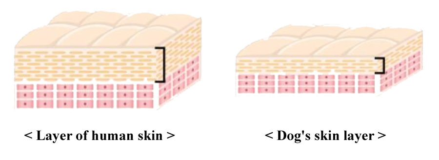 - Dogs’ epidermis is three to four times thinner than humans, making it more sensitive.